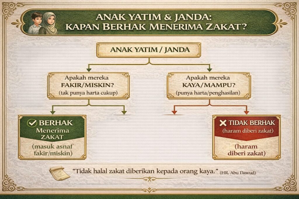 Kedua, anak yatim dan janda bukanlah golongan mustahik zakat secara otomatis. Mereka hanya berhak menerima zakat jika termasuk dalam kategori fakir, miskin, atau gharim. Status yatim atau janda semata tidaklah cukup.